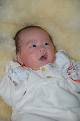 顔の湿疹が痒いのだろうか、朝起きると慎太朗の顔に引っかき傷が・・・・。ア〜ァ折角の生後2ヶ月の記念撮影も、 顔に傷があったのでは・・・トホホホやな。 |