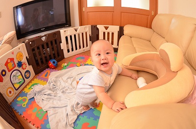 『しまってあったサークルの出番がようやくやってきました。お座りや這い這いも出来るようになると、行動範囲が突然広くなり、サークルの出番です。』 |