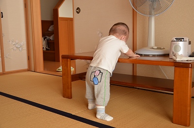 慎太朗は、這い這いはもちろん、伝い歩きも日ごと上達し、それに従って行動範囲も広くなって、リビングからダイニング、玄関ホールから和室へと這っていくようになる。 |